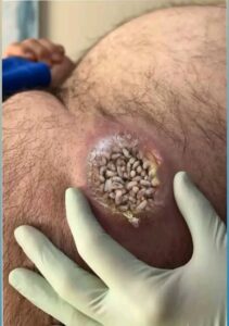 This image shows a close-up of a human body with a severe wound or ulcer on the skin.